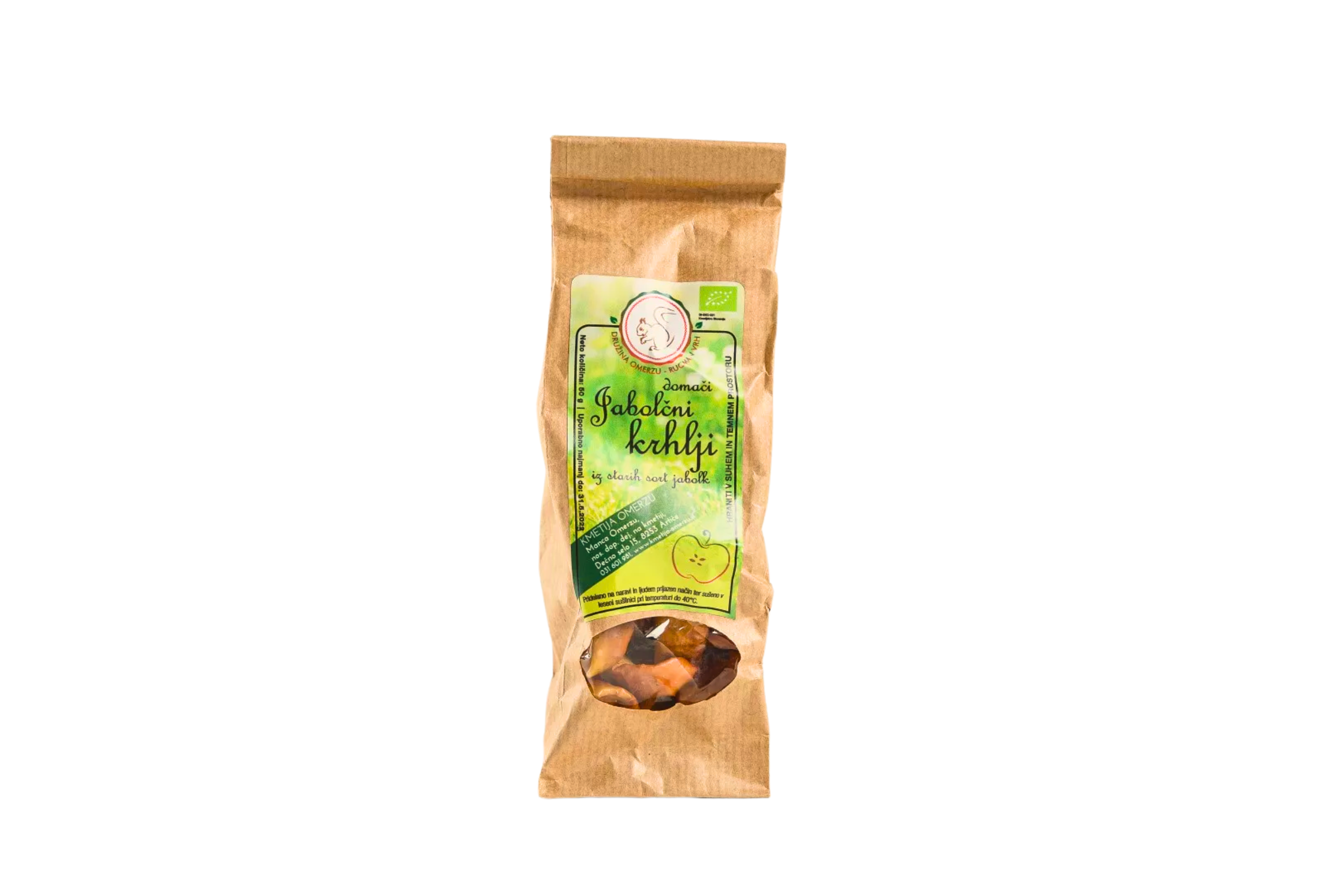 100% naravni jabolčni krhlji iz starih sort jabolk. Brez dodanih kislin in ostalih aditivov. Jabolka so neškropljena. Krhlje ročno režemo in sušimo v leseni sušilnici pri nizki temperaturi (max. 39°C). Ko so primerno suha jih pakiramo v papirnate vrečke.